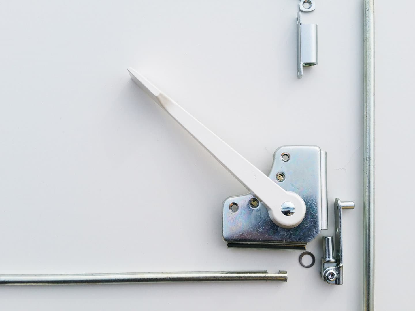 - 5 x 10 mm der Alu-Hebel ist weiß pulverbeschichtet Lieferung bestehend aus: 1 Stück Umlenkgetriebe mit weißem Hebel und Unterlage 1 Stück Eckgelenkunterteil