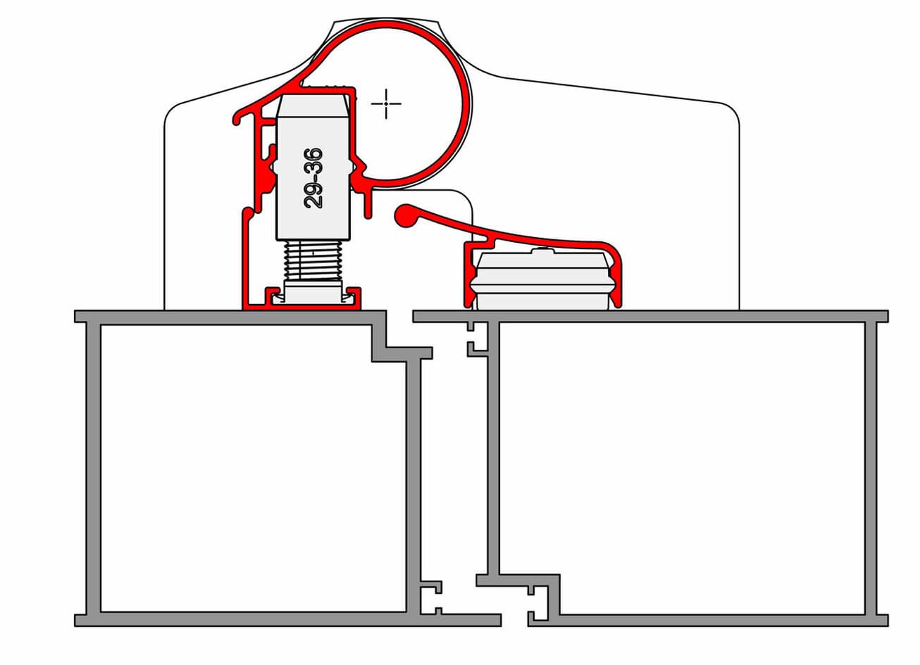 - einstellbar für Drehpunkte der Türbänder von 20 mm bis 36 mm