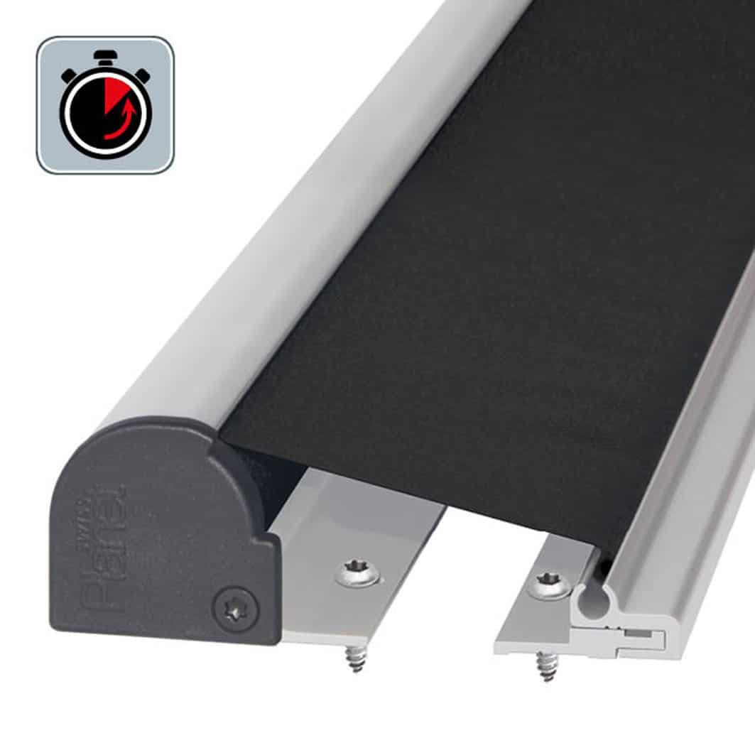 - mit integriertem, selbsttätig auf konstante Spannung ziehendem Rollo in schwarz