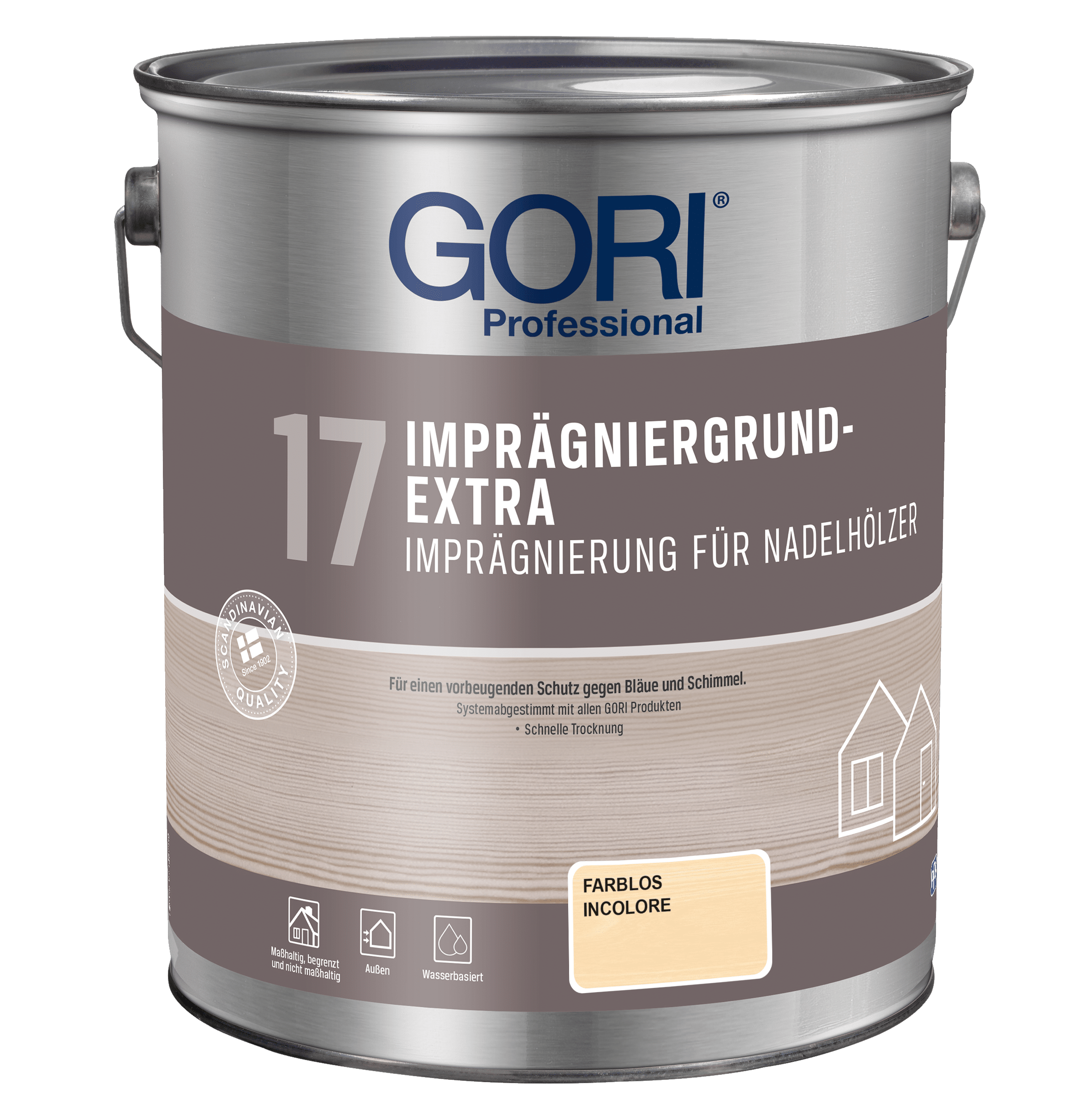 Gori 17 – Imprägniergrund WB ist der tiefenwirksame Bläueschutz für rohe unbehandelte Hölzer im Aussenbereich.