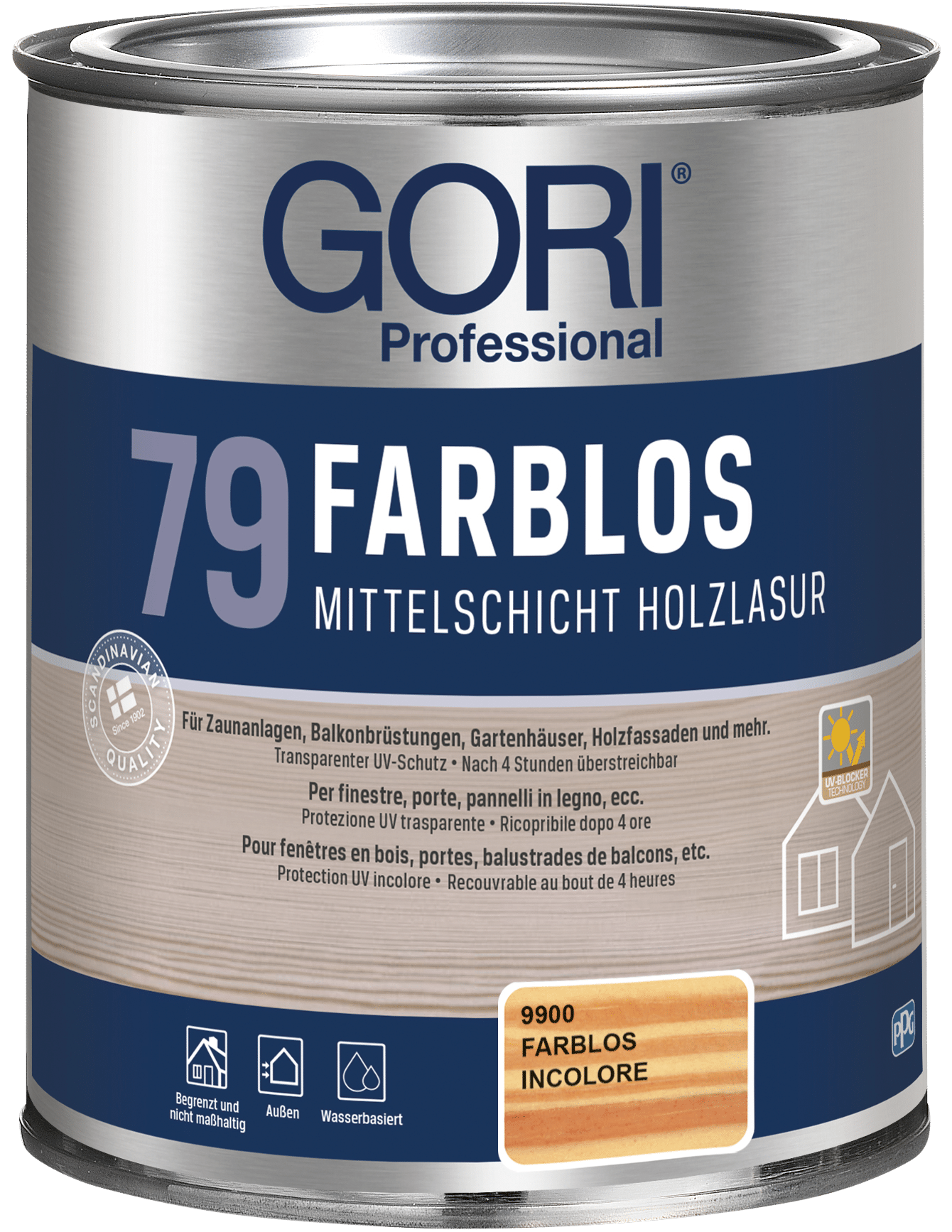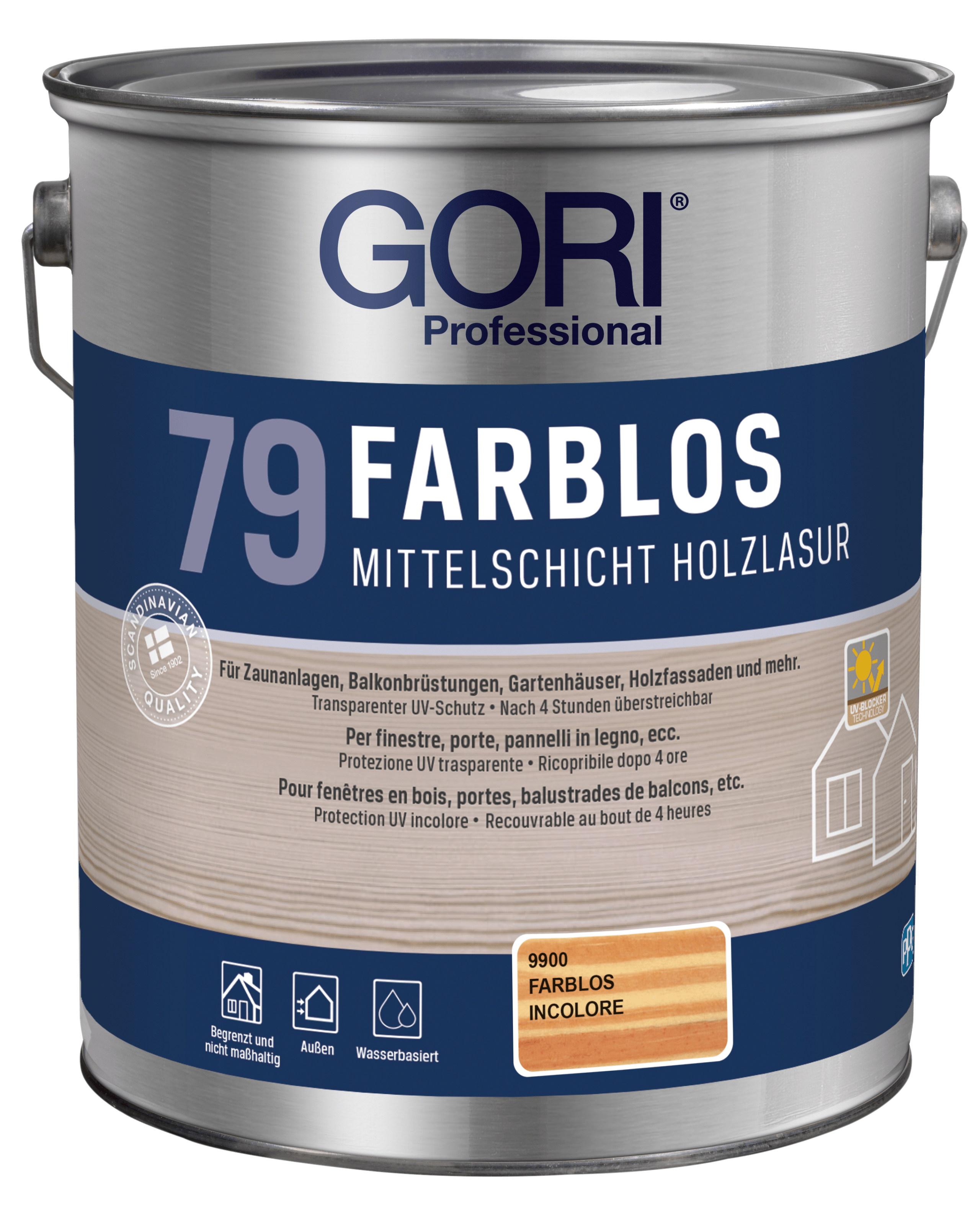 Gori 79 ist ein farbloser, durchsichtiger und seidenglänzender Lasuranstrich zum dauerhaften Schutz von Holz vor Witterungseinflüssen im Aussenbereich. Besonders geeignet auch für maßhaltige Bauteile wie Türen, Tore und Fenster (auch Innenseiten) aber auch für Holzhäuser, Balken, Dachüberstände, Zäune usw.