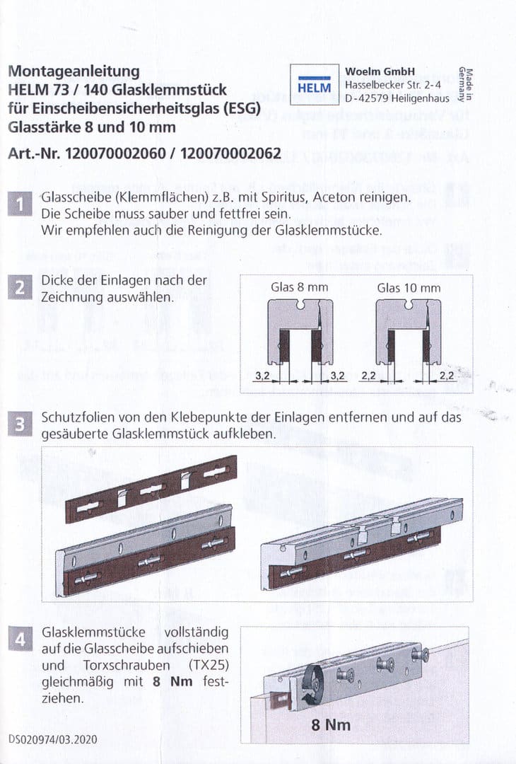 - SAF 80 und SAF 120 werden mit Schrauben M 8 ausgeliefert Lieferung bestehend aus: 2 Stück Glasklemmleisten aus massiv ALU silber eloxiert 2 Stück Spezialschrauben M 8 x 40 mm 4 Stück Klemmschrauben je Leiste aus Edelstahl mit Torx-Aufnahme TX 25 4 Stück Unterlegplatten für Glasstärke 8 oder 10 mm 1 Stück Maulschlüssel Glasklemmstück Helm 73/140 250 mm ESG/VSG ca. ca. 0