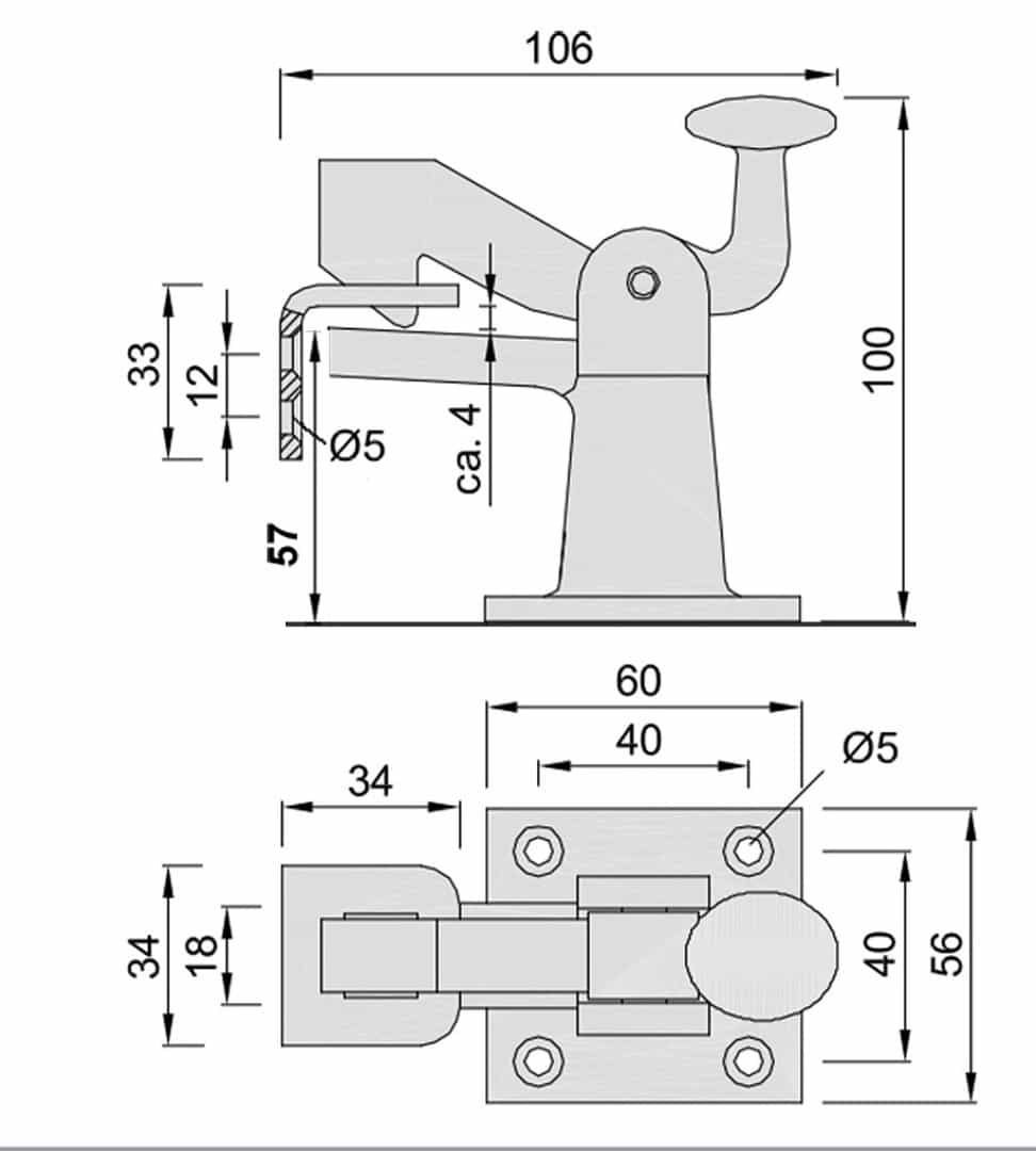 Montage: Der Torfeststeller wird, bei größtmöglichen Abstand zum Torband, mit Schrauben und Dübeln auf den Boden geschraubt. An entsprechender Stelle wird der Haltewinkel mit 4 mm höhenmäßigem Abstand zur Anschlagplatte des Feststellers mit 3 Schrauben so am Tor befestigt, dass sich die Schraublöcher unter dem Fangloch befinden. Beim Feststellen des Tores dient dadurch der Haltewinkel auch als Anschlagfläche.