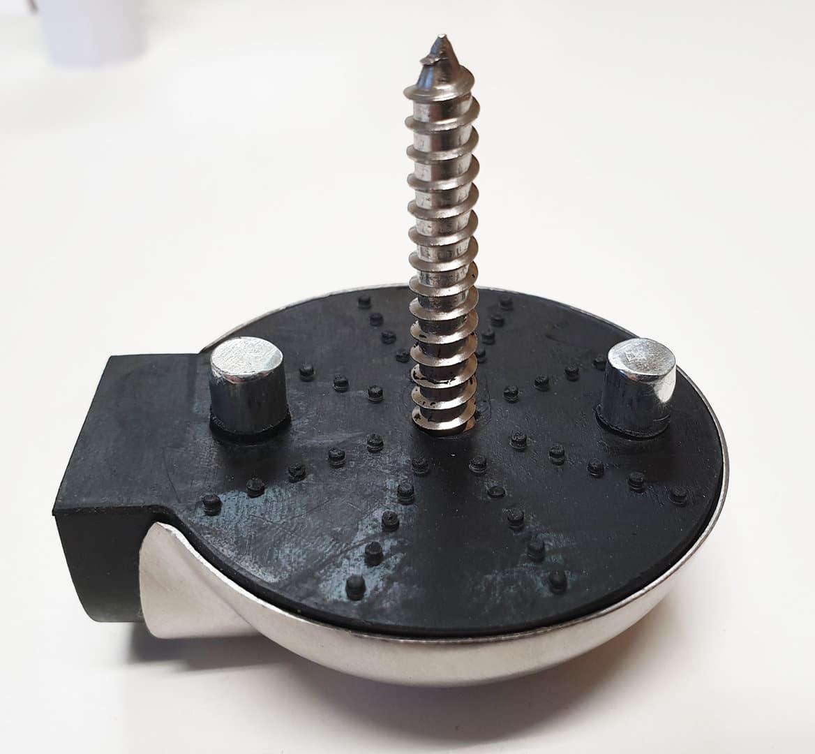 - tritt und stoßfest die Bauform als Schildkröte übersteht auch derbe Fußtritte Edelstahl matt gebürstete Abdeckkappe schwarzer langlebiger Gummi mit 2 Verdrehsicherungen fest eingelassen Durchmesser: 57 mm Höhe: 22 mm Gewicht: 100 g inkl. Edelstahlschraube 5 x 60 mm und Dübel 8 x 50 mm mit Bohrschablone